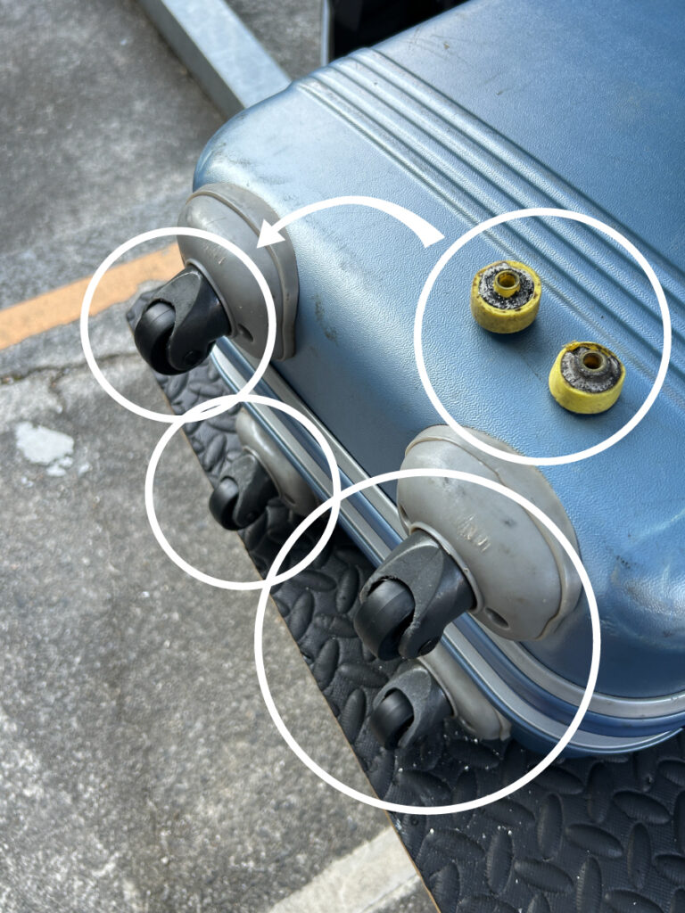 - スーツケース修理★ダブルタイヤのキャスター4箇所交換修理のご依頼